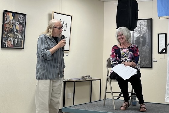Two readings awaited in the beloved homeland for that anniversary celebration. First, one at the HERE Gallery in Santa Fe where my guest poet, Liz Burk, and I were welcomed by owners and painters Gary Barten and Katherine Meyer. Joy! as you can see in the photos. What can I say? Naturally It was good to be home and read for old and new friends and colleagues, some I met for the first time in person after years on zoom. Their warm and enthusiastic response moved me as much as my reading and voice moved them… It was a precious experience of reciprocity through poetry.